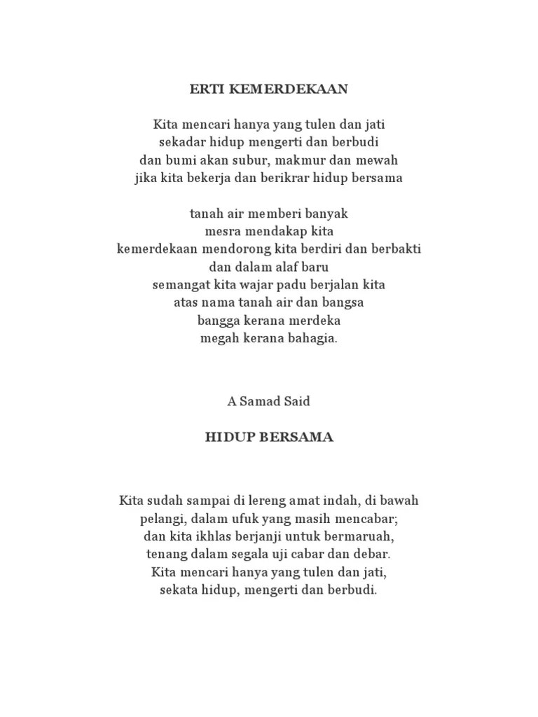 Koleksi contoh sajak kemerdekaan malaysia terbaik & terkini tentang koleksi contoh sajak kemerdekaan malaysia terbaik. Samad said♬ yayamanfly · 4.2mb · 04:35download mp3 play. Pemikiran yang terdapat dalam puisi 'hidup bersama' karya a. Puisirama merdeka (antologi bersama), : Samad said bertemakan idealisme bangsa demi kemerdekaan malaysia. Pada era kemerdekaan, perjuangan sastera diteruskan oleh sasterawan negara seperti usman.